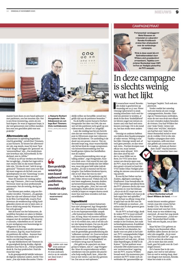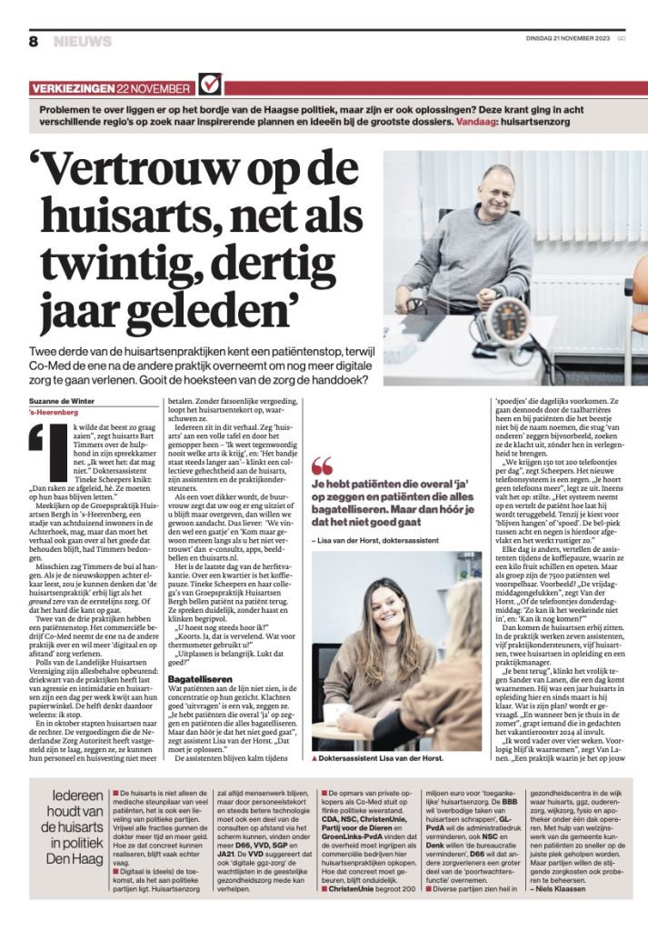 In een artikel voor o.a. de Gelderlander, AD, de Stentor en andere dagbladen, werd ingezoomd op de huisartsenzorg. Aanleiding: de naderende verkiezingen. Wat valt er te beschermen, te behouden, te verbeteren?