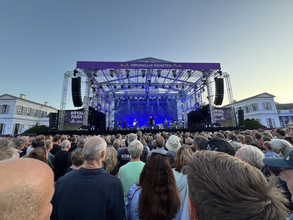 Nog geen jaar na het Elbow-concert in Carré, kreeg ik die kans, weer op een speciale locatie: De tuinen van Paleis Soestdijk. Iedere zomer in de maand juli worden daar bijzondere concerten georganiseerd. De setting is al schitterend, met de zij-armen van Paleis Soestdijk die het podium koesterend omarmen, met het vallen van de avond ook nog eens verfraaid met mooie projecties. Het terrein is stijlvol aangekleed, rondom is een festival-achtige ambiance opgebouwd, waar af en toe twee manshoge papegaaien of giraffen door het publiek lopen. Een zeer aangenaam zonnetje met bijpassende fraaie luchten na zonsondergang viel niet te plannen, maar was er toch! Gezelschap van Henny, René, Karen, Sabine en Hugo was wel te plannen, en maakte het uiteraard helemaal af.