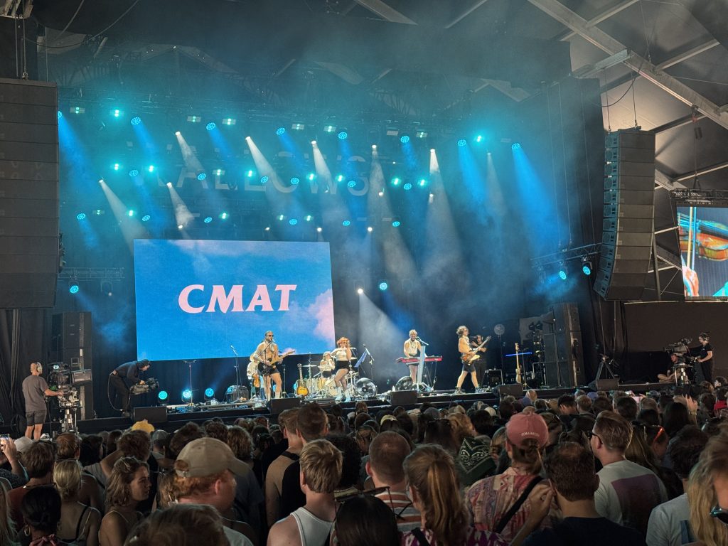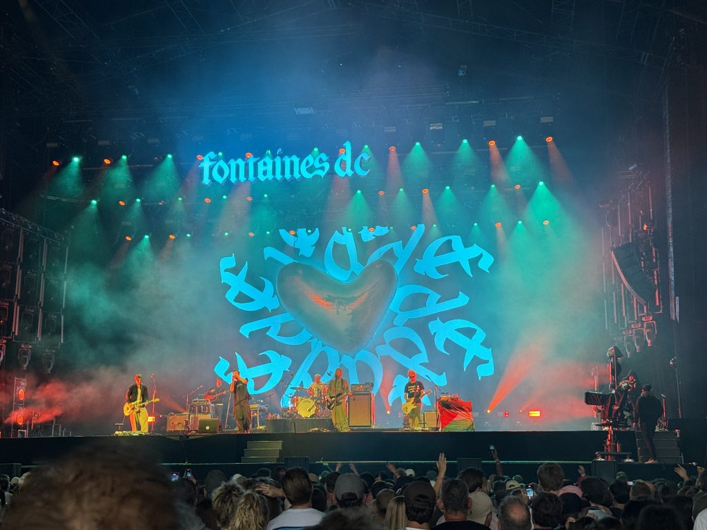 Ik probeer nog een stukje Still Woozy mee te pakken, maar zoals dat gaat op festivals lees ik in de app wanneer ik bij de Bravo aankom (dat is de andere kant van het immens grote festivalterrein) dat iedereen al weer naar de Alpha is, en zó kom ik dus aan 37.000 stappen op zo’n dag! Met de blaren op mijn voeten sta ik wel op tijd op een mooie plek bij Khruangbin, en die voeten krijgen even rust, omdat Khruangbin zeer relaxte muziek maakt. Een mooi gestileerd podium, gestileerde muzikanten (drummer, bassiste, gitarist) die gestileerd bewegen terwijl ze hun gestileerde muziek spelen. Het oogt wel heel erg mooi en het klinkt ook geweldig, eigenlijk hoor je continu een zwoele ritmetrack met een gitaarsolo van een uur. Toch denken we na een half uur: Het is wel héél gestileerd, en wordt het ook wel een tikje saai (ik kan ook nooit een heel Khruangbin-album achter elkaar horen). Dat biedt kansen om op tijd naar Lola Young te gaan (n de Bravo ja, wéér de andere kant van het terrein. Nondeju). Maar daar puilt de tent werkelijk zo uit dat het kansloos is. We pikken Martijn op uit de stuiterende Australische punk van the Chats en splitsen even later toch weer naar Molchat Doma (Martijn dan, ik had ’t ook wel willen zien, hij was achteraf enthousiast) en Fontaines DC (dat was tóch het optreden waar ik het meest naar uit keek). Kwamen de verwachtingen uit? Niet helemaal, verklap ik vast, maar een goed concert was het echt wel. Ook bij Fontaines DC mis ik bij ieder album bij een paar nummers de klik, waardoor ik wel eens denk: Had van die vier albums er drie gemaakt die samen volmaakt waren geweest. En die nummers die er van mij dan uit mochten, werden hier toch gespeeld. Met een sound die in het begin nog bijgesteld moest worden en waarbij ik de drumsound tot het eind te hard vond. Maar het was ook een optreden met energie, met een stuiterende Grian Chatten als frontman, met gave gitaargeluiden, met “Big”, “Televised Mind” “Boys in the better land”, “Jackie down the line”, “Favorite”, “In the modern world” en afsluiter “Starbuster” als favorieten. Dus ja, zeker een goed optreden, maar niet eentje die bij de hoogtepunten genoemd gaat worden.