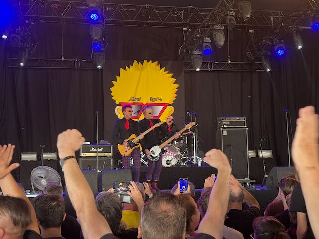 Want ook de volgende act is een trio: De Toy Dolls! Oude jaren ’80 helden van me, Nellie the Elephant pak ik er nog wel eens bij als ik een alternative DJ set mag draaien. Er is weinig veranderd aan de puberale pretpunk en er wordt volop gepogood vanaf het eerste nummer. Nou is “weinig veranderd” bij mij geen zekere aanbeveling. Hoewel ik het heel leuk vind om ze te zien, vervliegt de lol ook weer snel en heb ik het eigenlijk ook wel weer gezien na een half uurtje. Achteraf had ik misschien nog beter kunnen switchen naar de Niemanders, die met een grote groep “nobodies” (asielzoekers) een gevarieerde muzikale show maken en door de rest van onze groep hoog gewaardeerd wordt. Het fan-dom had echter anders besloten…